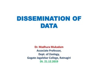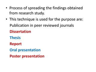 This document summarizes the key aspects of disseminating research data and scientific writing. It discusses the various techniques used to spread research findings, such as publishing in journals, theses, reports, and presentations. It also outlines the different types of research (basic, applied, translational) and how knowledge is applied. The document then reviews the components of a strong research paper, including following the "7 C's" of clear, correct, complete, concise, conformable, consistent writing. It provides guidance on the content and structure of different sections like the title, abstract, introduction, methods, results, discussion, and conclusion.