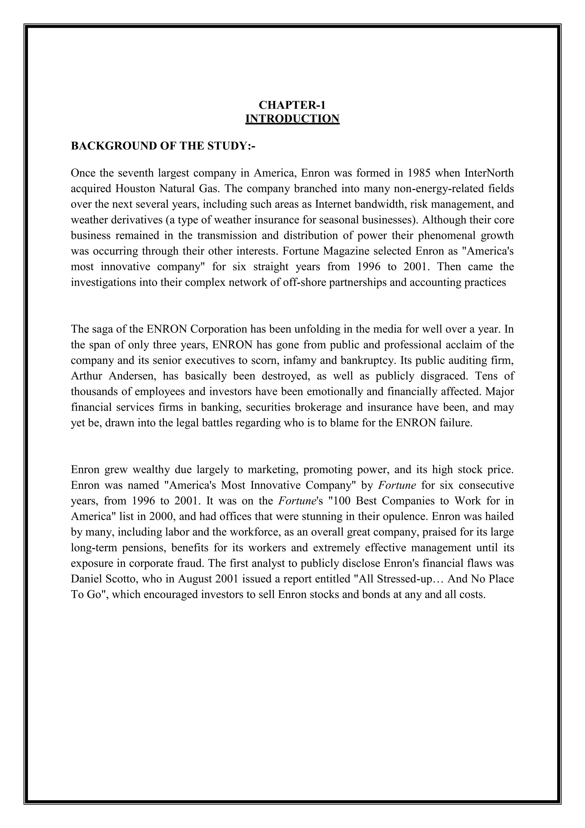 Enron was formed in 1985 through the merger of Houston Natural Gas and InterNorth. It grew rapidly through the 1990s becoming a large multinational corporation dealing in the sale of energy, communications, and pulp and paper. However, Enron hid massive debts and losses through off-balance sheet partnerships and questionable accounting practices. In late 2001, Enron filed for bankruptcy after revelations of accounting irregularities and institutionalized, systematic, and creatively planned accounting fraud were uncovered. The collapse of Enron cost investors and employees billions of dollars and significantly damaged the public's perception of the integrity of U.S. business practices and financial reporting.