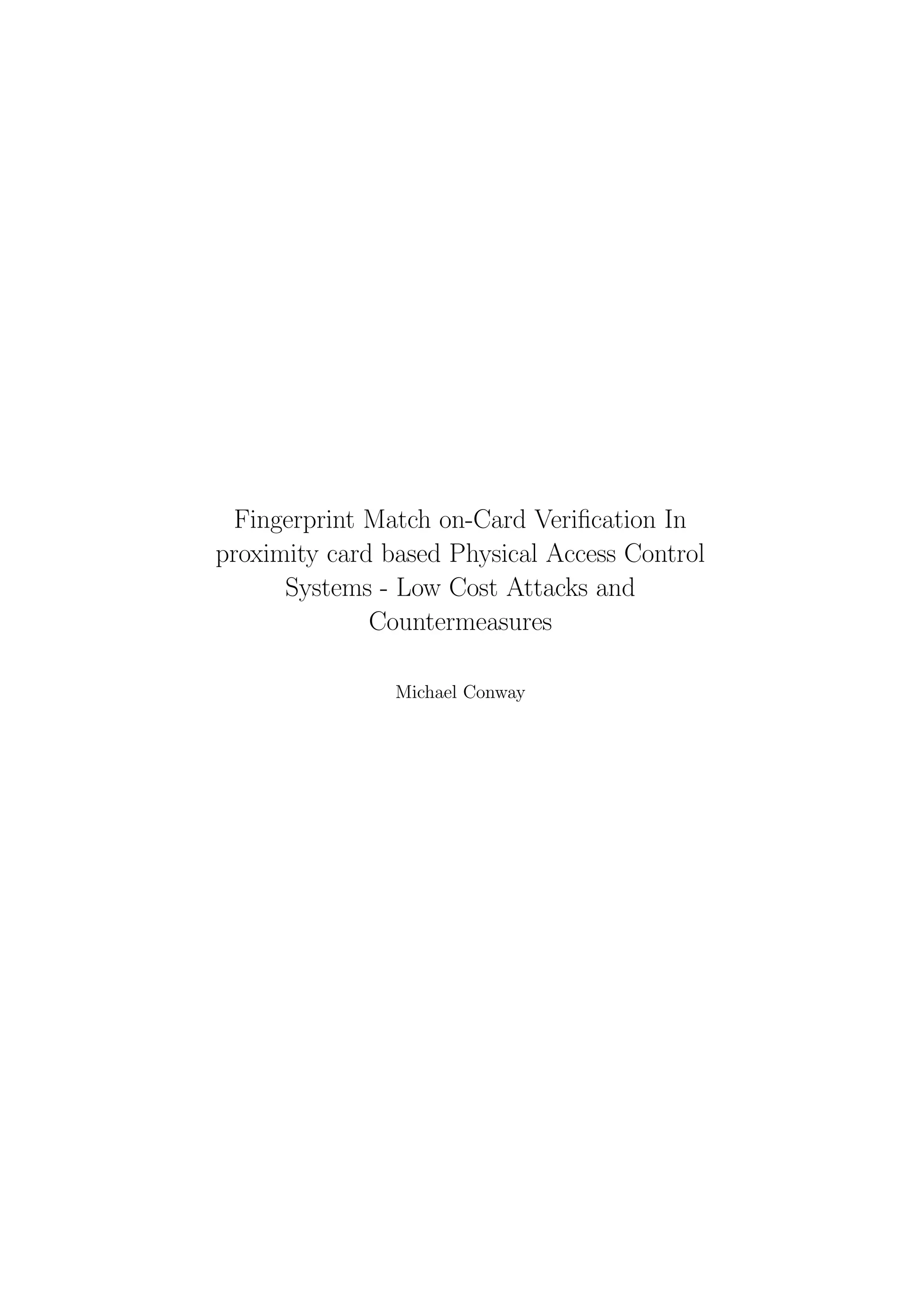 This document is a student's dissertation submitted as part of their master's degree program. It examines the use of fingerprint verification on contactless smart cards for physical access control systems. Specifically, it evaluates the security advantages and limitations of a "match on card" system by considering potential attacks an insider attacker could perform. It discusses low-cost attacks such as spoofing the fingerprint sensor, replay attacks across the contactless interface, and template extraction attacks. It also covers countermeasures like template protection through cryptographic techniques and feature transformation with salting and non-invertible functions. The goal is to assess the overall security of match on card verification given resource constraints on smart cards and a generic system architecture.
