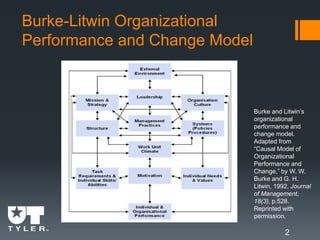 This document summarizes Gayle Wooten's 2014 dissertation which tested relationships among transformational factors in a postsecondary environment using the Burke-Litwin Organizational Performance and Change Model. Data was collected through a survey distributed to employees at four campuses of a statewide technical education system. Confirmatory factor analysis and structural equation modeling supported use of the Burke-Litwin model in explaining organizational performance in this context. Future research could further develop and apply the model in other higher education settings.
