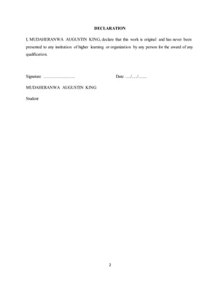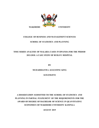 This document is a dissertation submitted by Mudaheranwa Augustine King to Makerere University in partial fulfillment of the requirements for a Bachelor of Science degree in Quantitative Economics. The dissertation analyzes time series data on malaria cases from 2012-2018 from Rubavu Hospital in Rwanda. The objectives are to establish the time-series properties of malaria cases in Rwanda and provide a forecast. Secondary data on malaria cases by year and severity were collected from hospital records and analyzed using statistical software. Tests were performed to determine trends in malaria incidence and an ARIMA model was fitted to provide a reliable forecast.