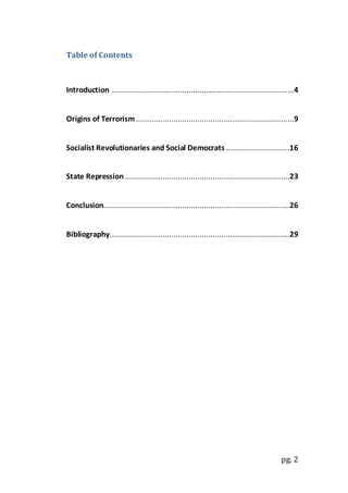 This document provides an introduction and first chapter to a dissertation on the threat of revolutionary terrorism in early 20th century Russia. It defines terrorism as using violence or threats of violence to further a revolutionary cause when open warfare is not possible. The introduction discusses the origins and growth of revolutionary groups in Russia in response to political and social frustrations under the autocratic tsarist regime. It argues that while terrorism on its own did not destabilize the state, it did weaken the government psychologically and hasten its downfall through assassinations of officials.