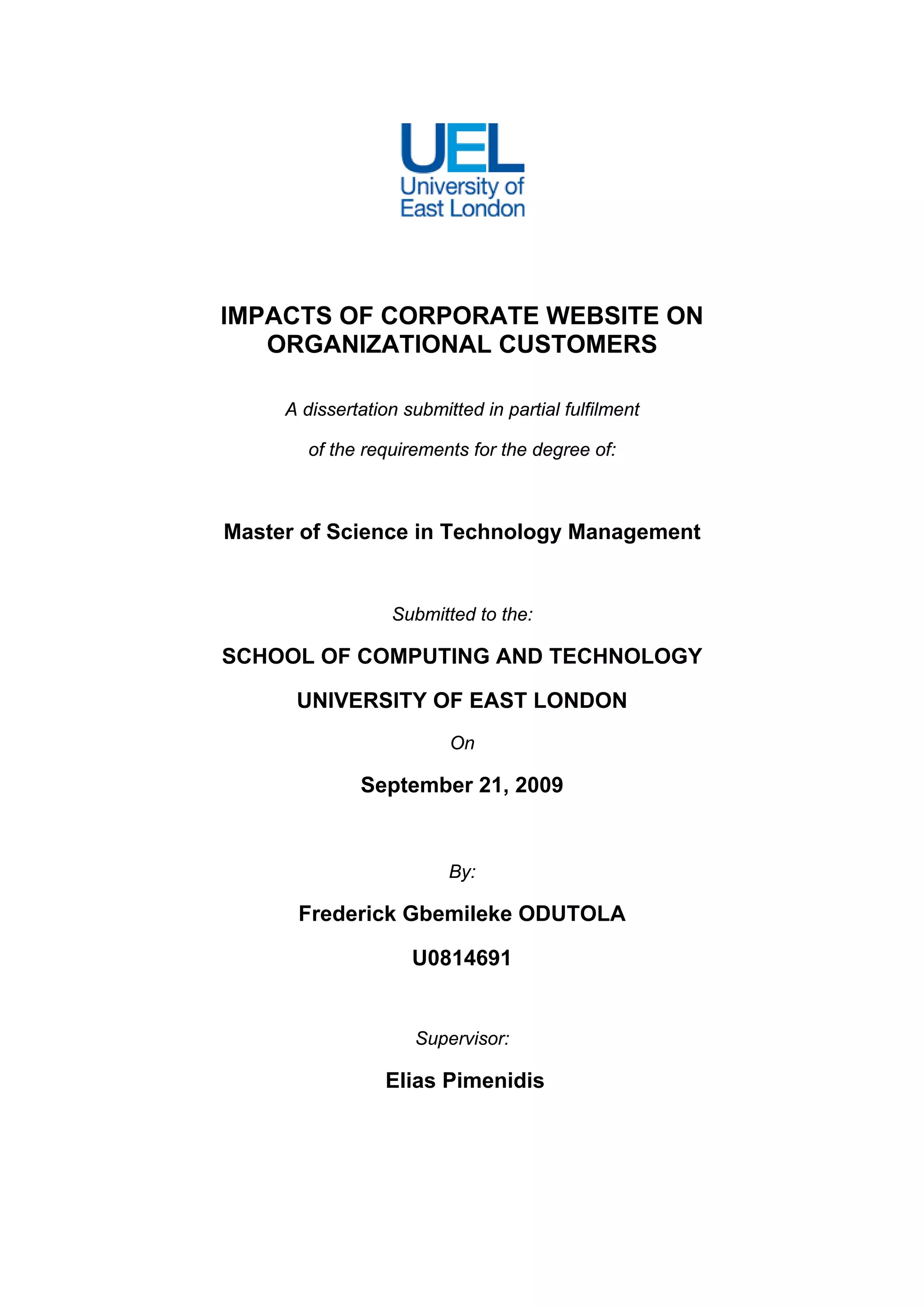 This document is a dissertation submitted by Frederick Gbemileke Odutola in partial fulfillment of the requirements for a Master of Science in Technology Management degree from the University of East London. The dissertation examines the impacts of corporate websites on organizational customers. It includes a dedication, table of contents, acknowledgements, and abstract. The main body of the dissertation will contain 6 chapters that introduce the research, review relevant literature, describe the research methods, present case studies, analyze the case studies, and provide conclusions and recommendations.