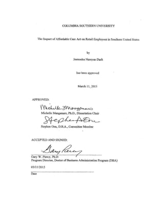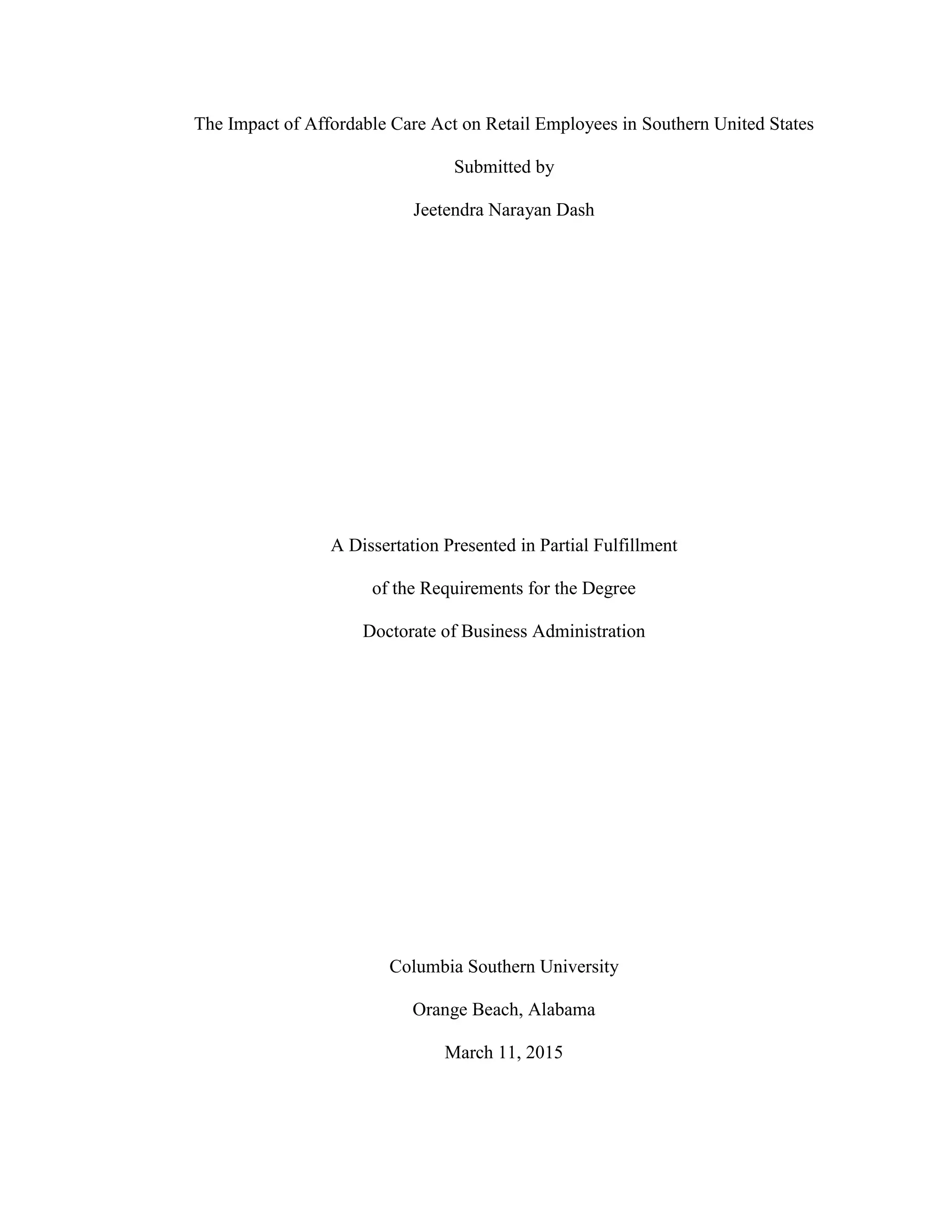 This document is a dissertation submitted by Jeetendra Narayan Dash to Columbia Southern University in partial fulfillment of the requirements for a Doctorate of Business Administration degree. The dissertation examines the potential impact of the Affordable Care Act on retail employees in the Southern United States migrating from employer-sponsored health insurance to the ACA marketplace. Dash conducted a survey of 203 front-line retail executives in the Southern US to determine if and to what degree migration would occur. The survey found that age, ethnicity, and annual household income were somewhat likely to influence an employee's decision to migrate, but no variables were a significant factor in modeling the relationship. Most employees still valued employer-based coverage and lacked a clear understanding of the A