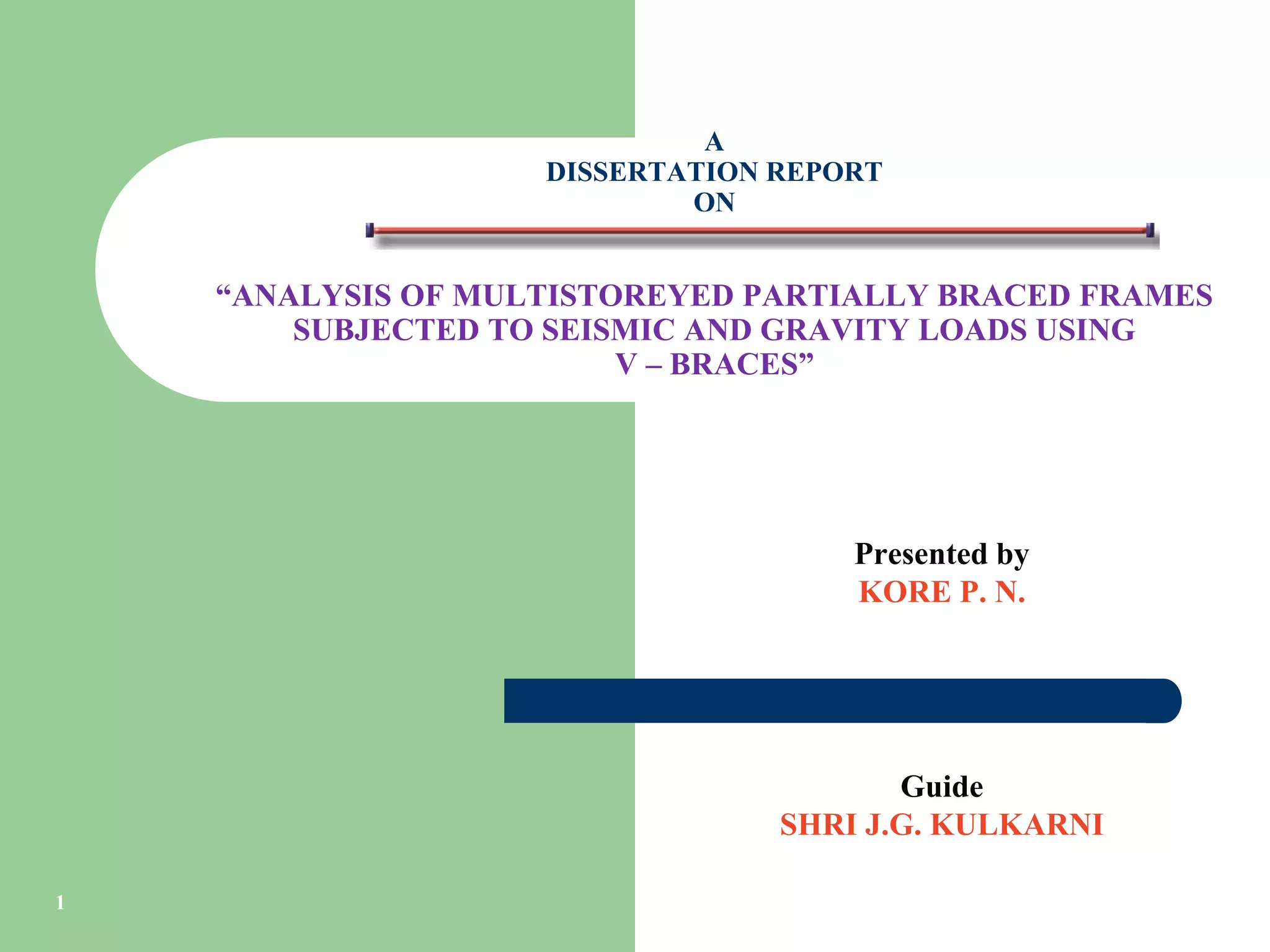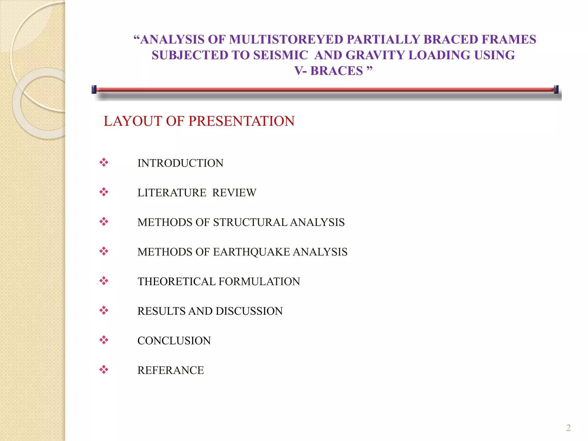 This document presents the layout and introduction for a dissertation report on analyzing multi-storey partially braced frames subjected to seismic and gravity loads using V-braces. The layout includes sections on introduction, literature review, structural analysis methods, earthquake analysis methods, theoretical formulation, results and discussion, conclusion, and references. The introduction discusses the importance of tall structures and braced frames, noting advantages of braced frames include increased strength, stiffness, and reduced member sizes.