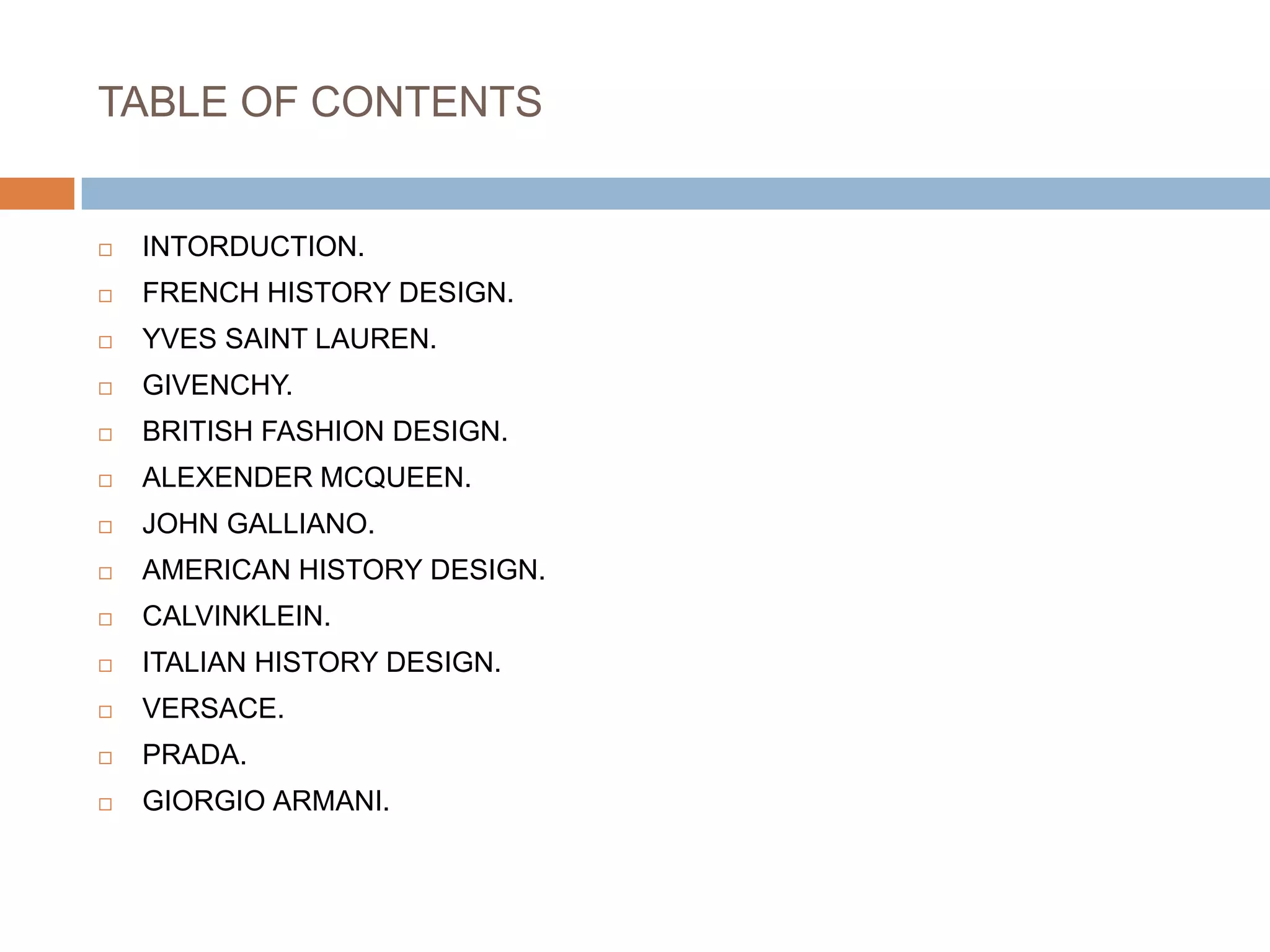This document provides an overview of fashion history from several regions and designers. It discusses the history of French, British, American, and Italian fashion design. For French design, it mentions Yves Saint Laurent and Givenchy. For British design, it discusses Alexander McQueen and John Galliano. American design highlights Calvin Klein. Italian houses covered include Versace, Prada, and Giorgio Armani. The document also provides a brief introduction to fashion history in Pakistan.