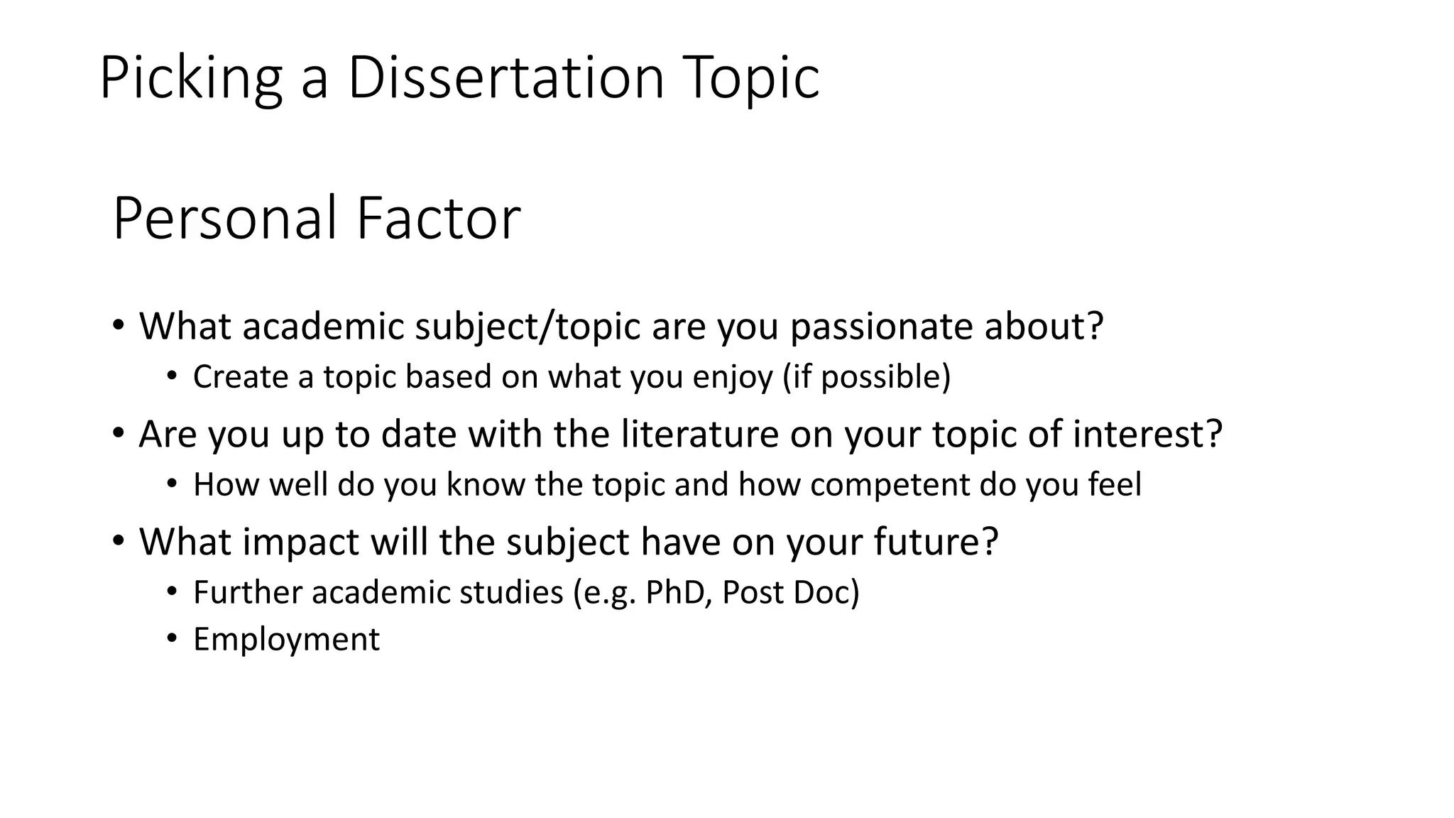 This document provides guidance on selecting a dissertation topic, including considering personal and external factors. Personal factors to consider include academic interests, topic knowledge, and relevance to future goals. External factors involve topic manageability within time/resource constraints, relevance to the course of study, originality, significance, and suitability for quantitative, qualitative or mixed methods. The document outlines dissertation grading criteria including requirements for distinction, merit, and pass marks. Example dissertation proposals and formatting guidelines are also provided, as well as resources for searching online thesis databases.