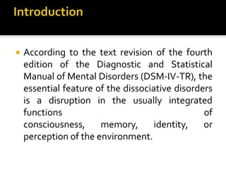 The document discusses various dissociative disorders as defined by the DSM-IV-TR including:
