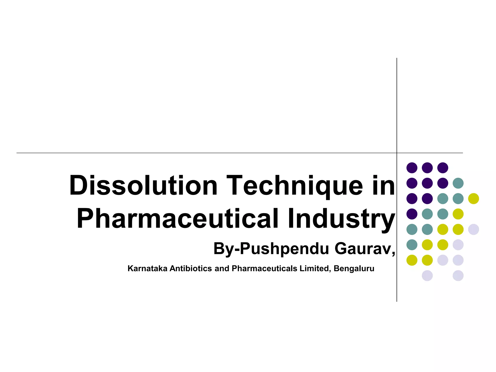 This document discusses dissolution testing techniques used in the pharmaceutical industry. It begins with introductions to dissolution testing, including its history and importance. It then covers development of dissolution methods, including characterizing drug substances and formulations, classifying drugs based on solubility and permeability, and selecting test conditions like apparatus, medium, agitation, and time points. The document discusses compendial and regulatory expectations for dissolution testing as well as validating dissolution methods.