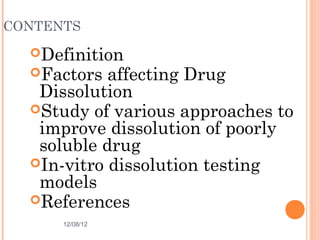 This document discusses dissolution testing, which involves measuring how quickly a solid drug substance dissolves in solution. It defines dissolution and factors that affect the rate. These include drug properties like solubility, particle size, and solid form, as well as dosage form properties and excipients. Common in vitro dissolution testing models are described, including basket, paddle, and flow-through methods. Acceptance criteria for dissolution testing and methods for comparing dissolution profiles are also summarized.
