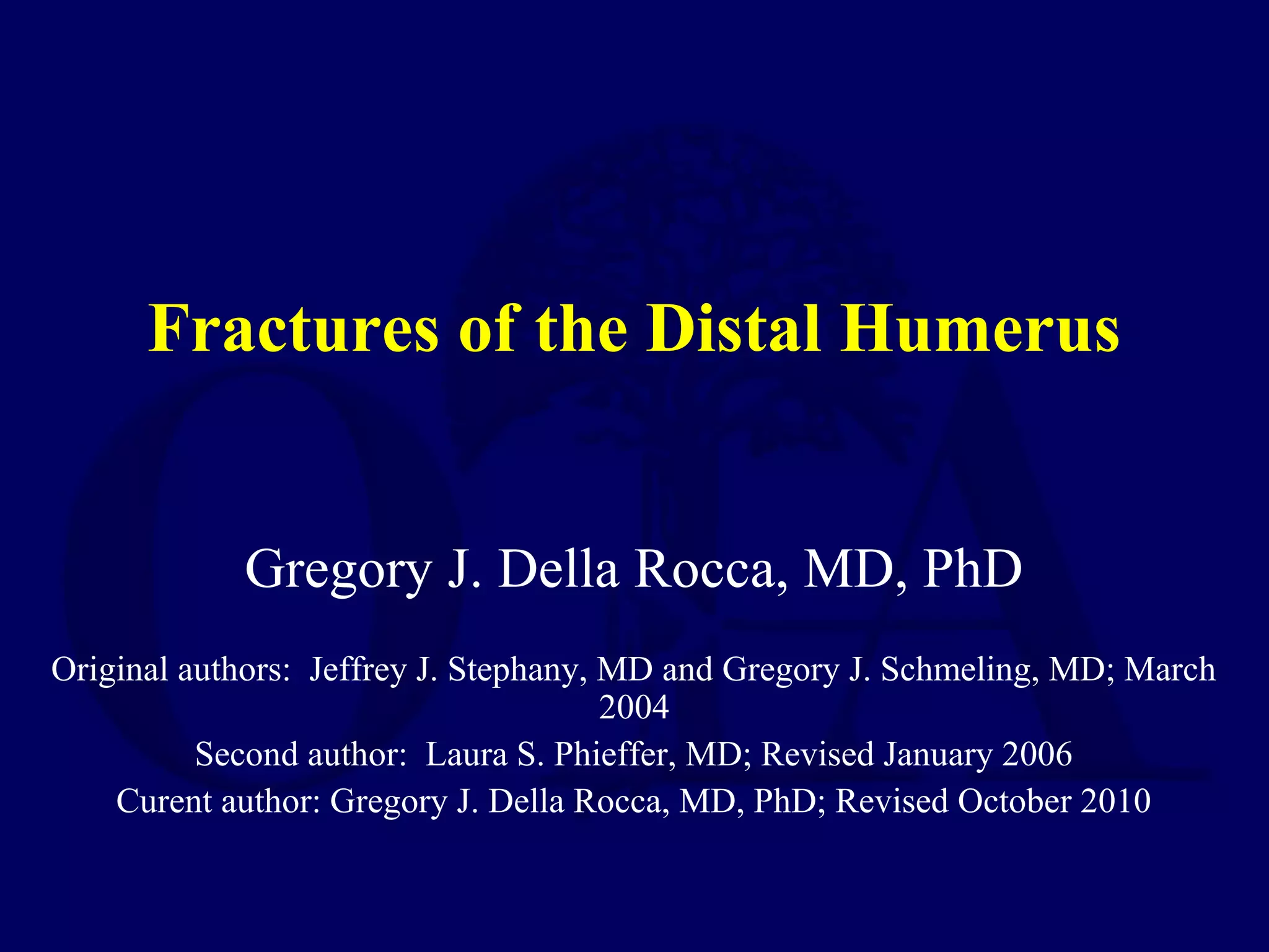 The document discusses fractures of the distal humerus, including the functional anatomy, surgical anatomy, mechanisms of injury, evaluation, classification systems, treatment principles focusing on anatomic reduction and stable fixation, surgical techniques including exposures and osteotomy fixation options, and considerations for treatment in elderly patients which may include total elbow arthroplasty. Classification systems aim to describe the injury, guide treatment, and allow for research and comparison of outcomes.