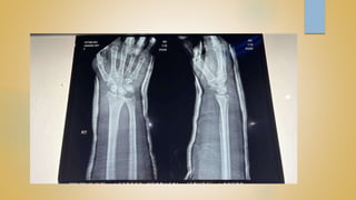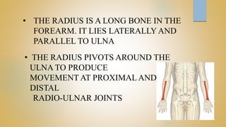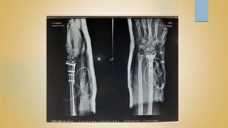 Distal radius fractures are the most common orthopedic injury, often resulting from a fall on an outstretched hand, with a higher incidence in females and older patients. Treatment can be either non-operative or operative based on fracture stability and patient factors, and various classifications exist for different fracture types. Complications may include nerve neuropathies, mal-union, and non-union, with pediatric patients representing a significant portion of such fractures.