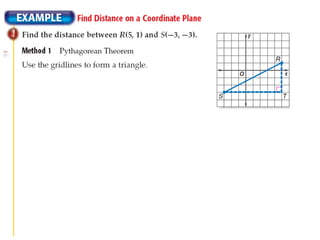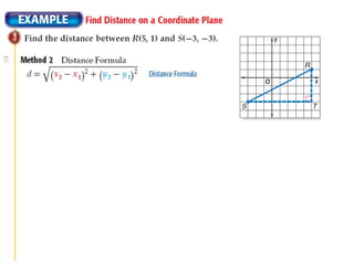 1) The document discusses distance and midpoints between two points in coordinate geometry. It defines the distance formula as the absolute value of x2 - x1 plus y2 - y1. 2) It presents the midpoint formulas, where the x-coordinate of the midpoint is (x1 + x2)/2 and the y-coordinate is (y1 + y2)/2. 3) Examples are given to find the distance between two points, and to determine the midpoint or endpoints of a line segment given coordinates of two points.
