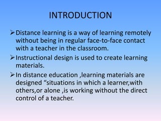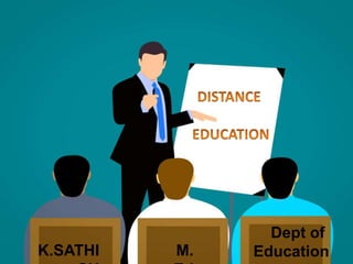 Distance education allows students to learn remotely without face-to-face interaction with teachers. It has various names like correspondence courses, extension courses, and online education. Advantages include self-paced learning and low costs, while disadvantages are limited interactivity and inability to show motions. Distance education is important in India due to rapid population growth, geographical limitations, and allowing students to work and study simultaneously. Major universities like IGNOU and OUC in India and China use distance education to meet growing demand and help skill development. Future of distance education involves new technologies that provide interactive learning environments and evolving learning management systems to meet learner needs.