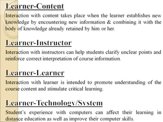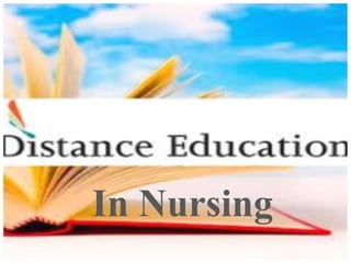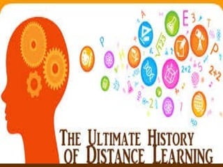 Distance education is an alternative mode of learning that does not require students and instructors to be physically present in the same location. It can be delivered synchronously, with all participants present at the same time, or asynchronously through flexible scheduling. Key characteristics include the separation of students and teachers throughout the learning process and the use of technical media to deliver course content and enable two-way communication. Distance education aims to provide flexible access to learning and has grown significantly with advances in communication technology.