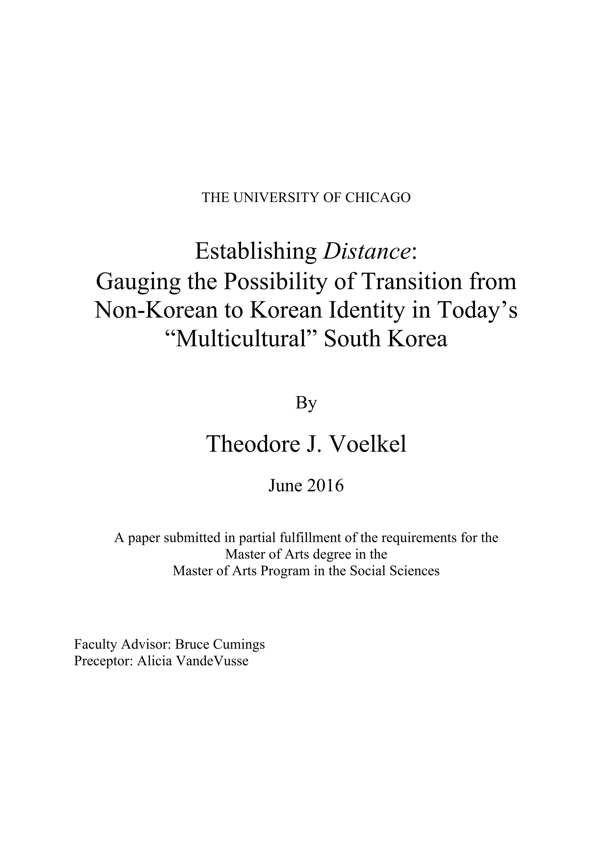 This document is a paper submitted for a Master's degree that examines Korean identity and conceptualizations of foreigners in South Korea. It conducts 21 qualitative interviews with younger South Koreans to investigate how their sense of Korean identity may influence views of non-Koreans. The paper hypothesizes that stronger identification with being Korean positively correlates with viewing non-Koreans as foreign, creating distance between Koreans and others. It aims to provide insights into how a multicultural Korean society can be constructed by understanding Korean perspectives on identity and foreigners. Key concepts discussed include social emphasis on Korean identity at the individual level and social reinforcement of identity between Koreans, which may position Koreans in a privileged place over non-Koreans.