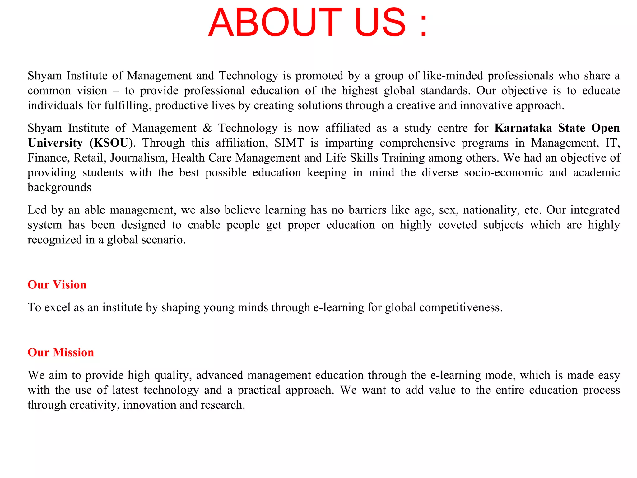 Shyam Institute of Management and Technology provides professional education through both on-campus and distance learning programs. It is affiliated with Karnataka State Open University to offer undergraduate, postgraduate, diploma and certificate programs in fields like management, IT, finance, and healthcare management. The institution aims to provide high quality education through e-learning to help students develop skills for global competitiveness.