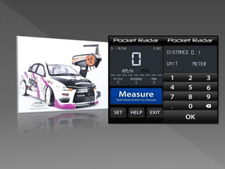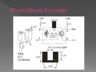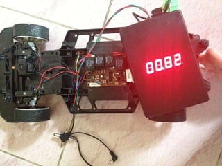 The document describes a project to create a measurement and calculation system for a radio controlled car. A rotary encoder and infrared module attached to the car's wheel act as sensors to measure distance traveled. The microcontroller uses the sensor data and wheel circumference to calculate distance, which is displayed on a 4-digit 7-segment display. The system can measure distance with an error of ±2.5 cm over 100 cm, depending on the surface. It is intended to study measurement, electronics, and for future education.