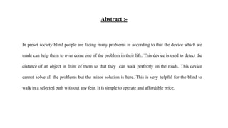 This document describes an ultrasonic distance measuring device to help blind people navigate safely. The device uses an Arduino, ultrasonic sensor, LCD display and speaker to detect objects and alert users to distances. It sends ultrasonic pulses and calculates distance based on travel time. The device enhances blind users' ability to identify distances and estimate spaces between objects. There is potential to add a camera and identify objects' names in the future. The conclusion is that the project successfully detects object distances and angles using ultrasonic sensors to help blind people navigate.