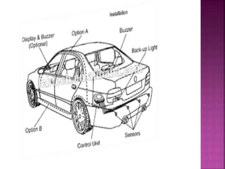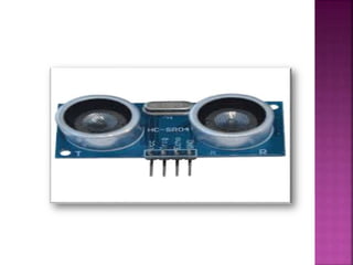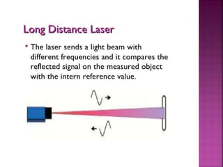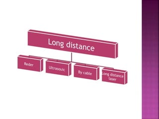 Distance sensors can be either long or short distance and work using echo location techniques like Doppler effect to detect objects. They emit an ultrasonic signal that bounces off a surface and is reflected back to the sensor, allowing the sensor to calculate the distance to the object by measuring the time between emission and reception of the echo. Common uses of distance sensors include air traffic control and car detection systems.