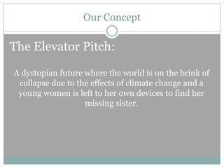 The document provides details about the concept for a dystopian film called "Distant Dawn" set in 2097. The world is on the brink of collapse due to climate change, with only parts of China, Europe, and Central America remaining functional. The protagonist's younger sister goes missing during a storm, so the protagonist searches for her sister in the ensuing chaos as no one can help. The film intends to shoot scenes in a supermarket and shopping district to depict a futuristic setting using props and costumes. The main characters are the protagonist Amy and her younger sister Fe.
