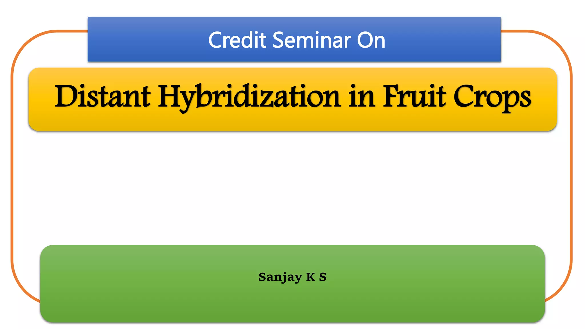 This document discusses distant hybridization in fruit crops. It begins by defining interspecific and intergeneric hybridization. It then reviews the history of important early hybrids created, such as triticale. The main features of distant hybridization are that it is used to transfer desirable genes between related species when the trait is lacking within a species. It can result in fully fertile, partially fertile, or fully sterile crosses depending on the species. Problems that can occur include cross incompatibility, hybrid inviability, hybrid sterility, and hybrid breakdown. Techniques to overcome these barriers include manipulation of ploidy levels, use of growth regulators, embryo rescue, somatic hybridization, and use of bridge species. Several case studies are presented