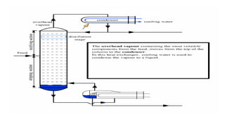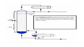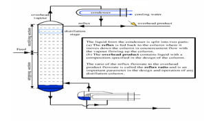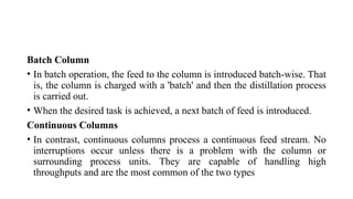 Distillation columns separate liquid mixtures based on boiling points, utilizing either batch or continuous processes. Essential components include a vertical shell, column internals (like trays/plates), a reboiler, a condenser, and a reflux drum. The operation involves generating vapour in the reboiler, with the reflux ratio determining the amount of liquid recycled versus removed as product.