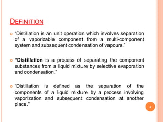 Distillation is a process that separates components of a liquid mixture based on differences in their volatilities. It involves heating the mixture to vaporize components, cooling the vapors to condense them, and collecting the condensed liquids. There are several types of distillation including simple distillation, flash distillation, and vacuum distillation. Simple distillation is used to separate components with very different boiling points, while flash distillation and vacuum distillation can separate components with closer boiling points. Distillation has many applications in industries like petroleum refining, organic chemical purification, and extracting essential oils from plants.