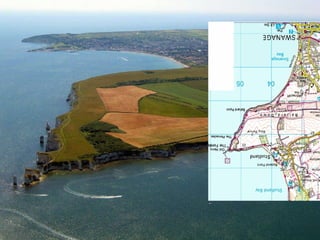 The document describes different coastal landforms formed by erosion processes. It discusses how headlands and bays form along coastlines with variations in rock hardness. Headlands project out and are more exposed to wave erosion, while bays form in areas of softer rock. As cliffs erode, waves cut notches and undercut the base, eventually leading to cliff collapse and the formation of wave-cut platforms. Within resistant cliff rocks, erosion enlarges weaknesses like faults to form caves, which can eventually be cut through to form arches or isolate stacks from the headland.