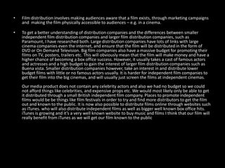 Optimum is a major UK film distribution company that releases films across several strands, including theatrical releases, DVD/Blu-ray releases, classic films, and world cinema. It has distributed over 200 films per year and focuses on British and independent films. Small, independent distributors will release lower budget films without big stars in independent cinemas, while large companies get films into major cinemas and have massive promotion budgets. The document discusses how an independent horror film without stars could be distributed through a small British distributor or online platforms like iTunes to build an audience.