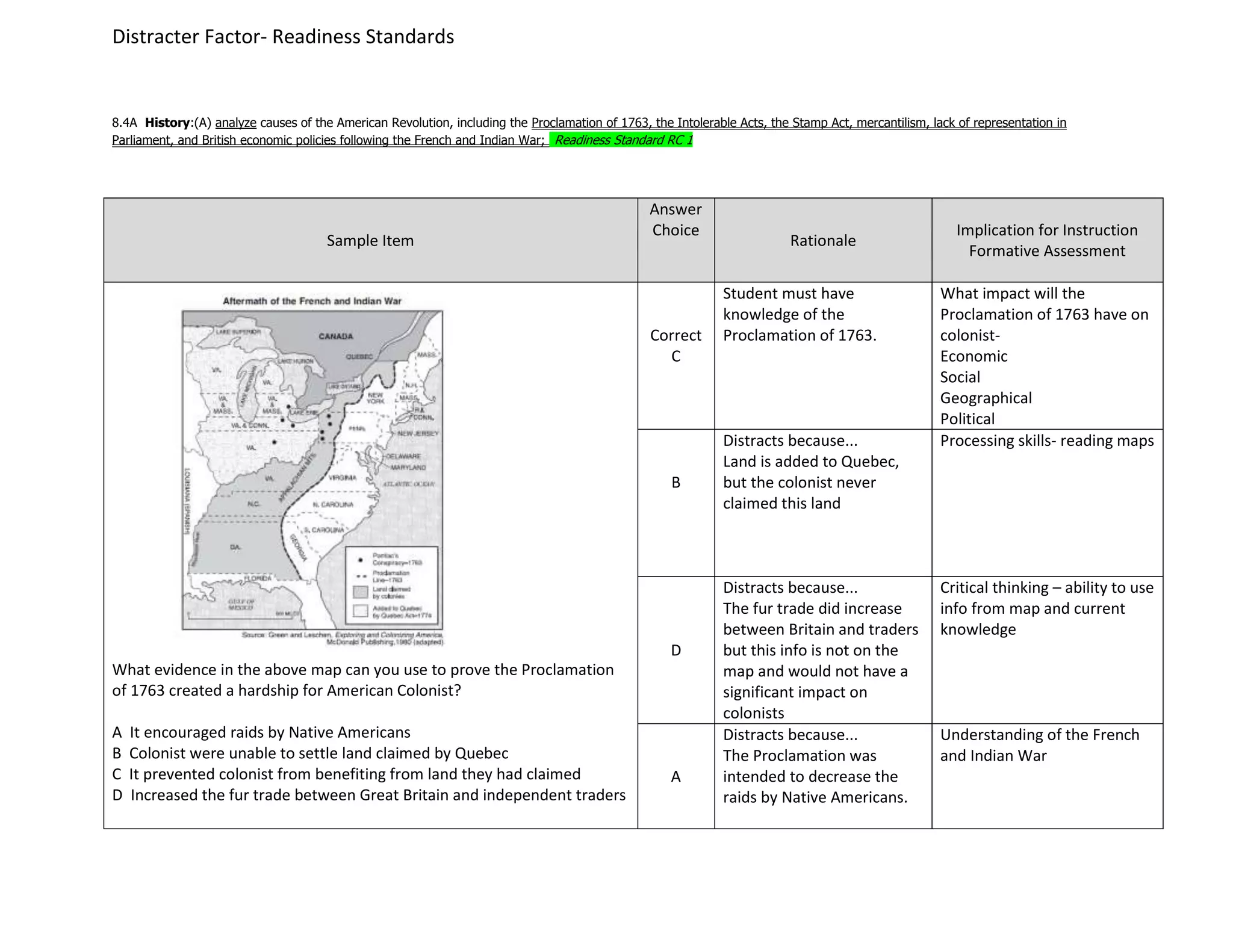 The document summarizes the causes of the American Revolution, including the Proclamation of 1763, the Intolerable Acts, the Stamp Act, mercantilism, lack of representation in Parliament, and British economic policies following the French and Indian War. It then provides a sample test question about the Proclamation of 1763 and the correct answer choice along with rationales for the distractors.
