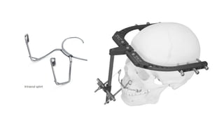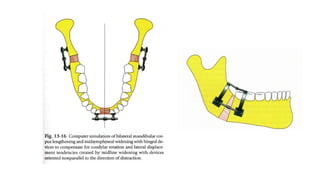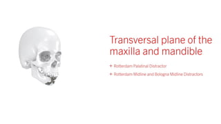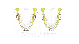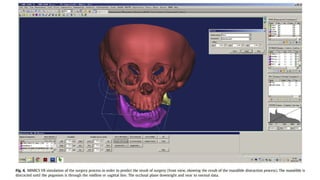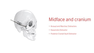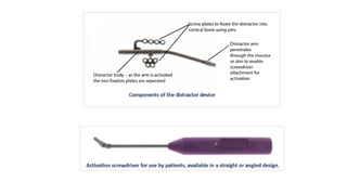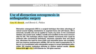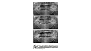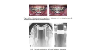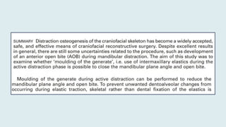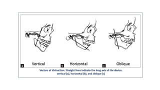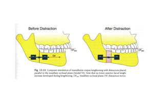 Distraction osteogenesis is a surgical technique used to induce new bone formation by gradually separating osteotomized bone segments, particularly beneficial in craniofacial reconstruction. The document elaborates on the history, principles, mechanisms, and implications of distraction osteogenesis, as well as its effects on both bone and surrounding soft tissues. It covers the procedure phases, classifications, and advancements in techniques, highlighting its significance in addressing congenital and acquired craniofacial anomalies.