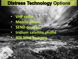 The document outlines various communication options for vessels, emphasizing the importance of VHF radios for safety and navigation. It discusses additional communication devices including satellite phones and emergency beacons, detailing their activation methods and operational features. It also highlights the need for proper registration of beacons for effective rescue coordination.