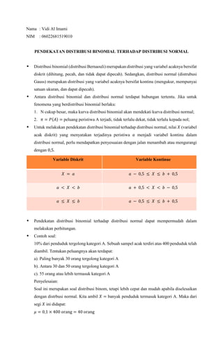 Dokumen ini membahas pendekatan distribusi binomial terhadap distribusi normal, menjelaskan hubungan antara keduanya dan bagaimana kurva distribusi binomial mendekati distribusi normal saat n cukup besar. Penyesuaian variabel diskrit menjadi kontinu diperlukan untuk kemudahan perhitungan. Selain itu, dokumen memberikan contoh soal yang menunjukkan penerapan pendekatan ini dalam menentukan peluang berdasarkan data yang diberikan.