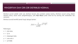 Distribusi normal, yang juga dikenal sebagai distribusi Gauss, adalah distribusi teoretis variabel acak kontinu yang berbentuk simetris atau lonceng. Distribusi ini memiliki sifat penting seperti rata-rata, median, dan modus yang sama dan mencakup proporsi data yang signifikan dalam jarak satu, dua, dan tiga simpangan baku dari rata-rata. Distribusi normal standar mempermudah perhitungan probabilitas dengan rata-rata 0 dan simpangan baku 1, dan luas total di bawah kurva adalah 1.