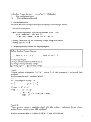 Dokumen ini membahas distribusi peluang teoritis, termasuk peubah acak dan kategori seperti peubah acak diskrit dan kontinyu. Disajikan juga rumus distribusi peluang binomial dan poisson, serta contoh aplikasi dalam menghitung probabilitas. Selain itu, dijelaskan distribusi normal lengkap dengan cara membaca tabel dan peluang terkait.