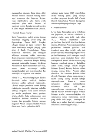 Dokumen ini membahas distribusi Poisson yang merupakan distribusi probabilitas untuk variabel acak diskrit, khususnya dalam konteks peristiwa yang jarang terjadi. Diciptakan oleh siemon D. Poisson, distribusi ini digunakan untuk menghitung probabilitas dalam banyak aplikasi praktis, seperti antrian pelanggan atau jumlah kesalahan dalam data. Penjelasan juga mencakup rumus distribusi dan contohnya dalam konteks situasi nyata.