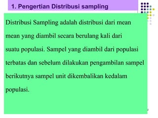 Dokumen tersebut membahas tentang distribusi rata-rata sampel dari suatu populasi. Secara singkat, distribusi rata-rata sampel adalah distribusi dari rata-rata nilai yang dihitung dari berbagai sampel yang diambil secara acak dari populasi. Dokumen ini juga menampilkan beberapa contoh perhitungan peluang terjadinya suatu kejadian berdasarkan distribusi rata-rata sampel.