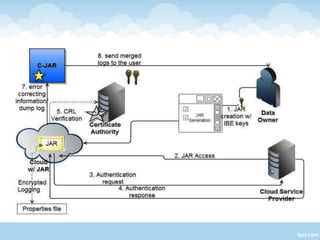 The document proposes a Cloud Information Accountability (CIA) framework to provide end-to-end accountability for data stored in the cloud. The CIA framework uses a logger component associated with each user's data to log all access and encrypt the logs. It also includes a log harmonizer that periodically collects encrypted logs and allows users to retrieve logs on demand for auditing purposes. The framework aims to enable data owners to track how their data is used while maintaining lightweight and decentralized logging.