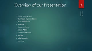 The document details the design and implementation of a distributed airline reservation system, covering components such as customer and admin interfaces, databases, and client-server architecture. Key features include flight booking, user authentication, and database management using SQLite. Additionally, it highlights hurdles faced, planned enhancements, and learnings from developing the system, emphasizing teamwork and technical skills acquired.
