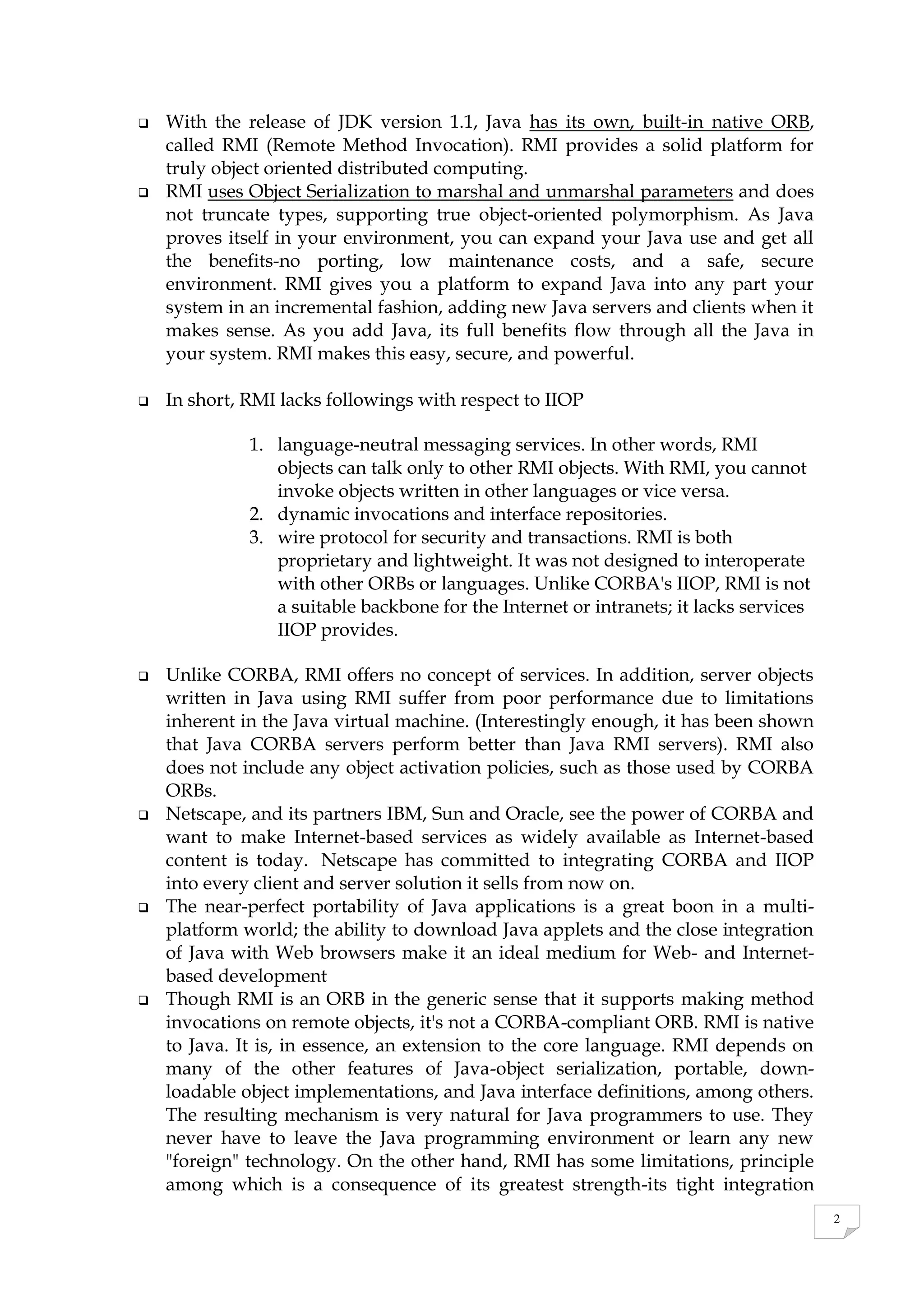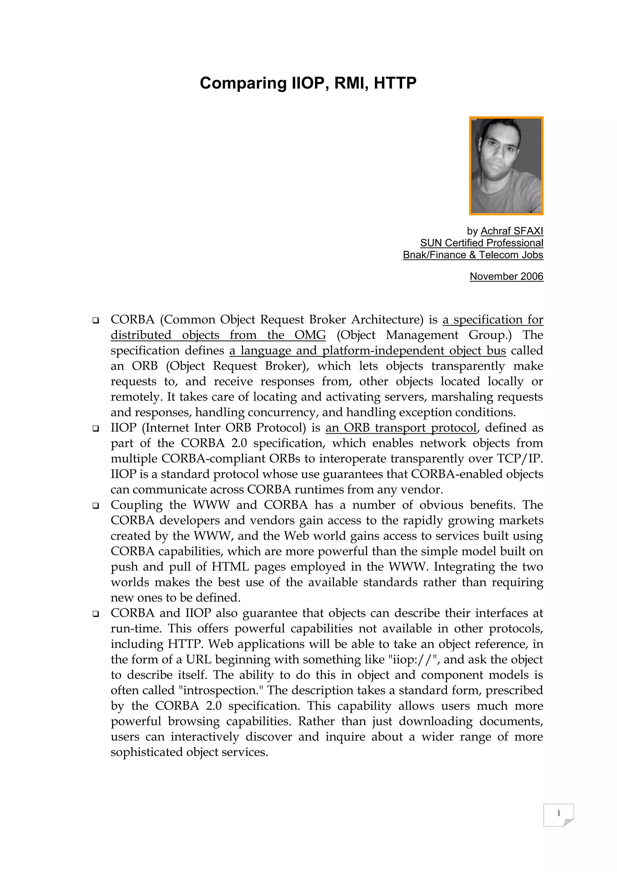 The document compares IIOP, RMI, and HTTP protocols. It states that IIOP is a CORBA transport protocol that enables interoperability between CORBA-compliant ORBs over TCP/IP. RMI is Java's built-in ORB that provides remote method invocation but lacks features like language interoperability that IIOP supports. While RMI is easier for Java programmers to use, IIOP is better suited as a backbone for the internet due to its supported services.