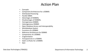 The document discusses distributed databases and distributed database management systems (DDBMS), emphasizing key concepts, architectures, advantages, and disadvantages. It outlines the characteristics of homogeneous and heterogeneous DDBMS, as well as various strategies for data fragmentation, allocation, and replication. Additionally, it covers transparency aspects such as distribution and transaction transparency, alongside Date's 12 rules for effective DDBMS implementation.