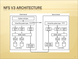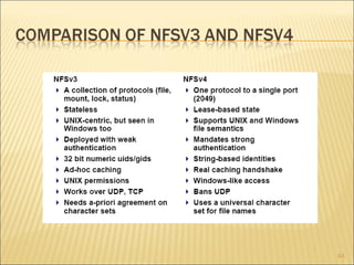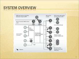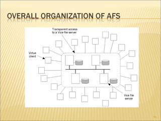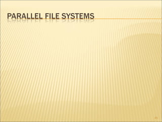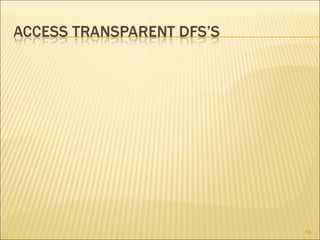 The document provides an overview of distributed file systems including NFS, Lustre, AFS, Coda, and Sprite. It discusses key concepts such as naming, caching, consistency, performance, replication, and security. Examples of different distributed file system architectures and consistency models are presented. Key goals and tradeoffs for different distributed file systems are outlined.