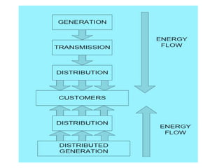 This document discusses distributed generation (DG), which refers to electricity generation located near the end users it serves. It describes how the traditional power system uses large, centralized power plants connected to customers via long transmission lines. DG provides benefits from the perspectives of end users, distribution utilities, and power producers. For end users, DG improves reliability and enables combined heat and power applications. Utilities see DG providing transmission capacity relief. Power producers can aggregate DG units to sell power into markets. The document also notes potential disadvantages like power quality issues and costs that need further examination regarding DG.