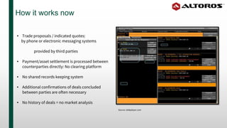 The document discusses the implementation of distributed ledger technology for OTC trading, highlighting the shift from traditional methods, which involve direct payment and lack of shared records, to a decentralized architecture using Hyperledger Fabric. It outlines the benefits of a consortium model where organizations maintain control over their clusters and the introduction of functionalities like 'private collections' for managing trade data. Additionally, it presents examples of transaction ledgers and interest netting, reinforcing the potential of blockchain in enhancing transparency and efficiency in trading frameworks.