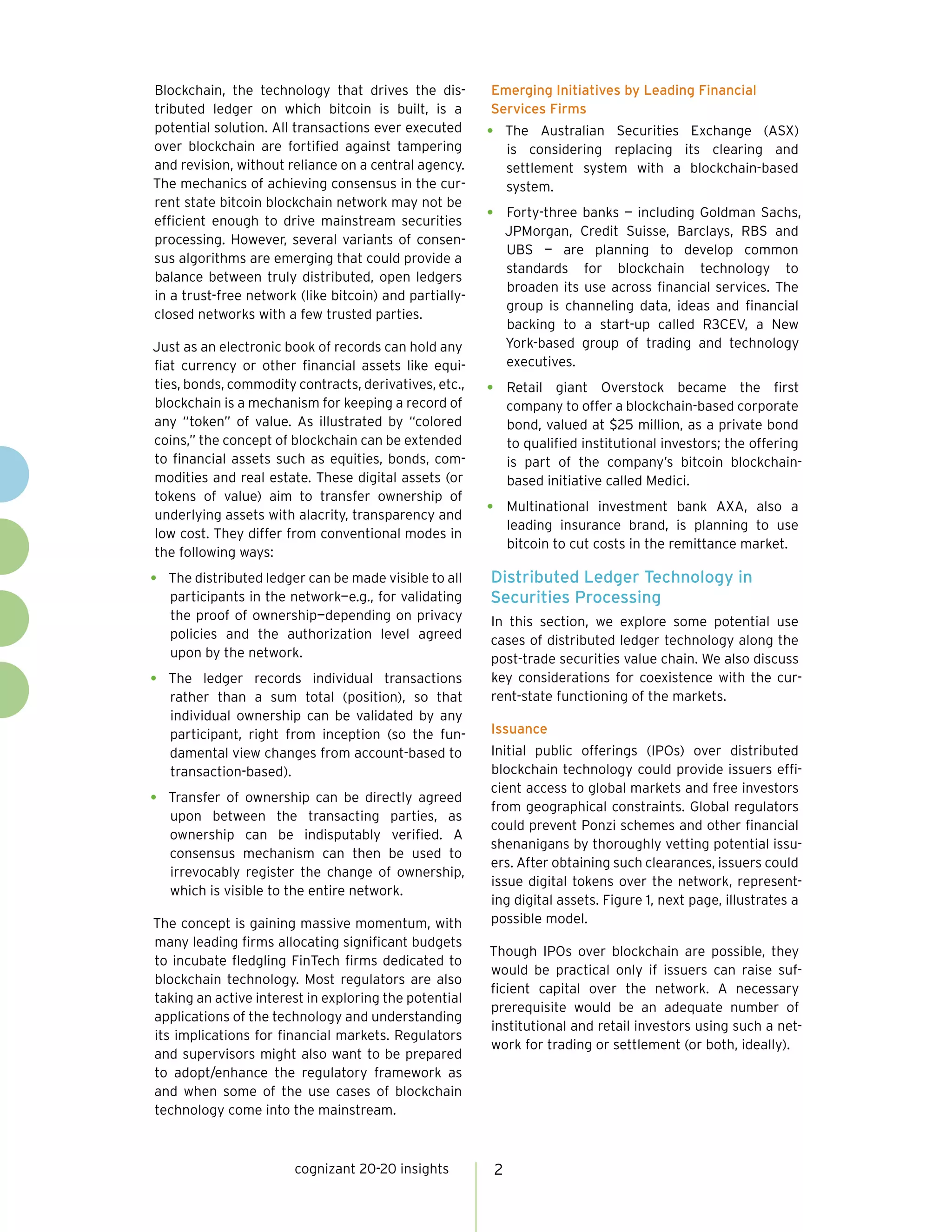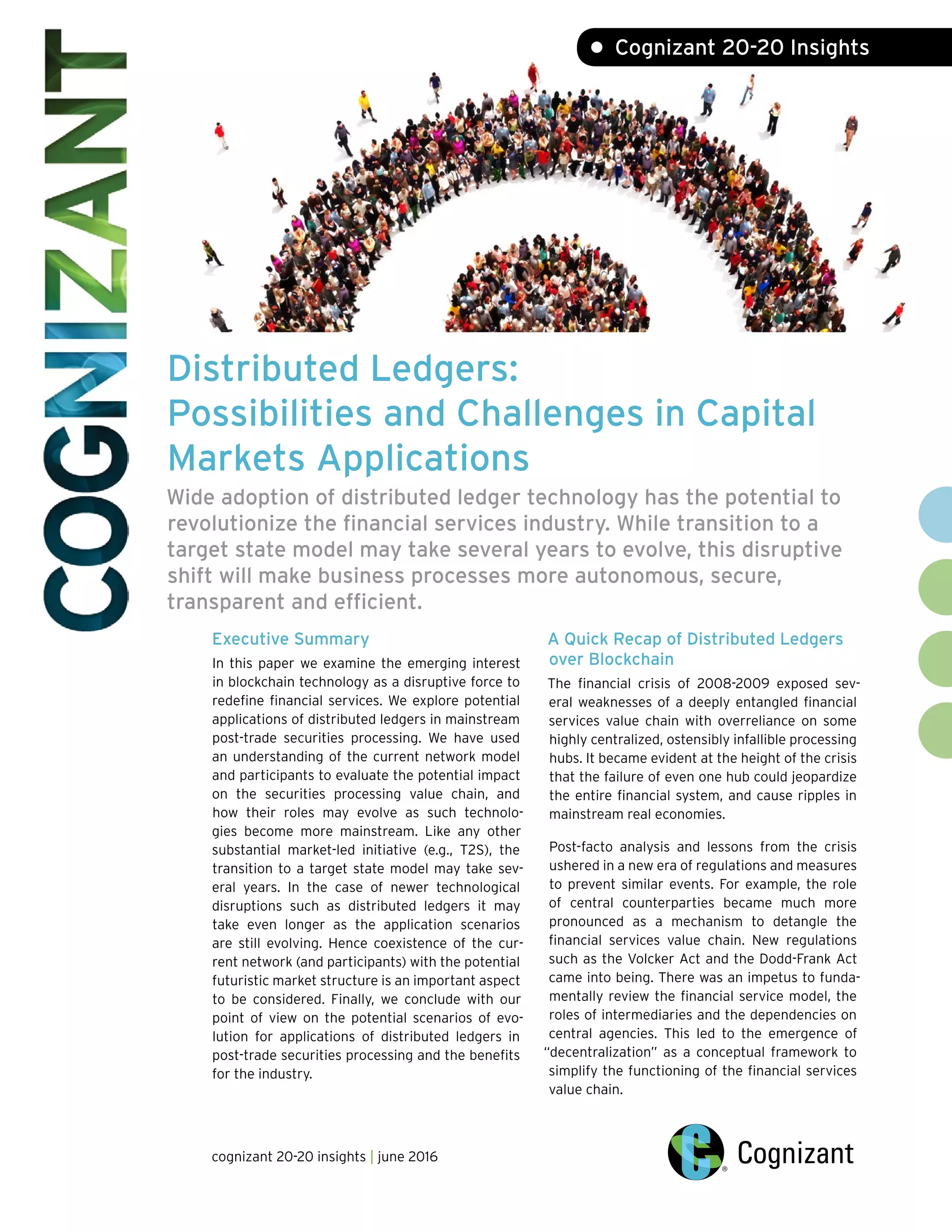 The document discusses the potential of distributed ledger technology (DLT) to transform capital markets, particularly in post-trade securities processing, making processes more autonomous, secure, and efficient. It highlights the need for a gradual transition from traditional systems to DLT, emphasizing coexistence with current practices and the evolving roles of market participants. The paper also outlines various use cases, regulatory considerations, and initiatives by financial institutions exploring blockchain applications.