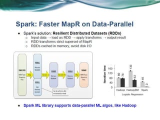 Machine learning can be distributed across multiple machines to allow for processing of large datasets and complex models. There are three main approaches to distributed machine learning: data parallel, where the data is partitioned across machines and models are replicated; model parallel, where different parts of large models are distributed; and graph parallel, where graphs and algorithms are partitioned. Distributed frameworks use these approaches to efficiently and scalably train machine learning models on big data in parallel.