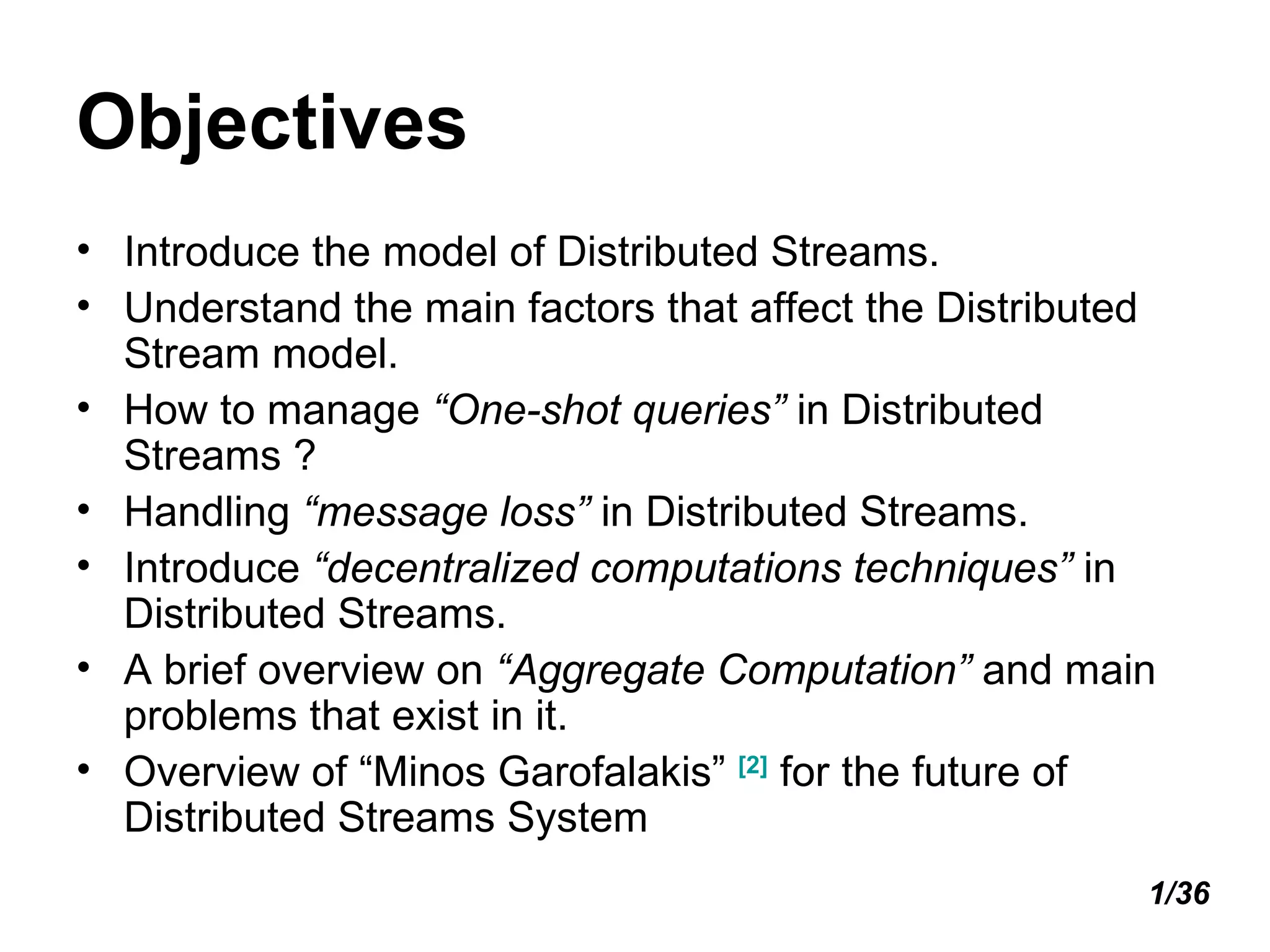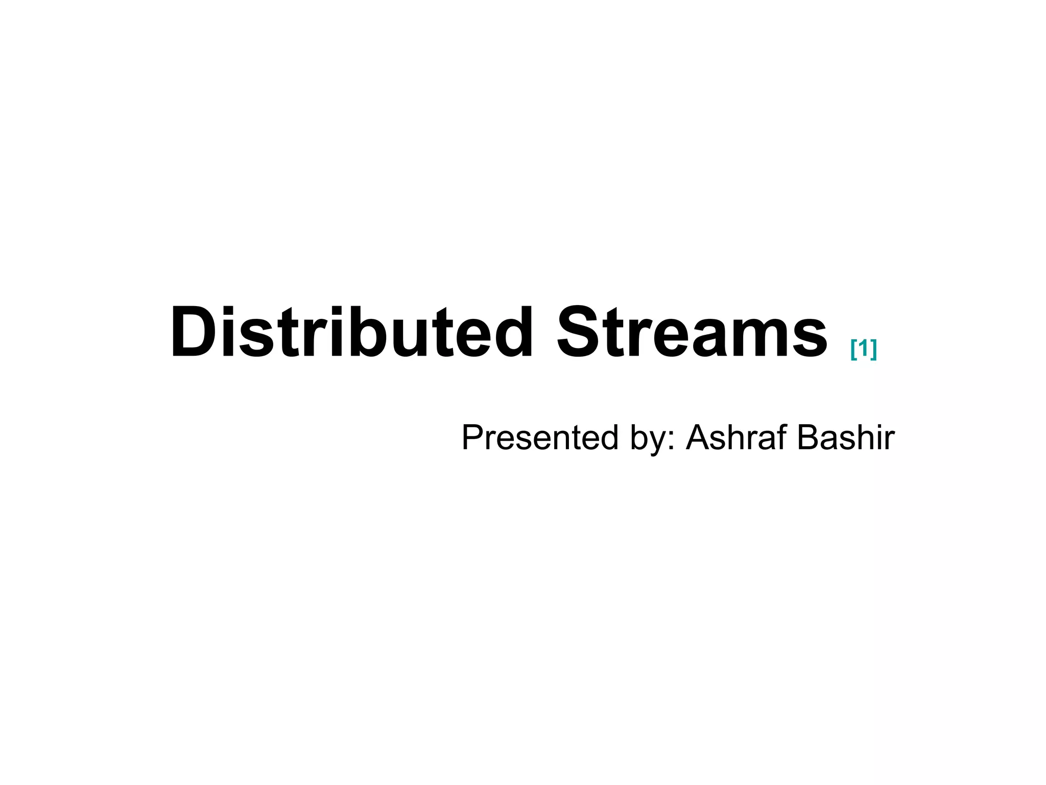 The document introduces distributed stream processing. It discusses maintaining synopses of streams using single-pass, small space and time algorithms. Distributed queries can be one-shot or continuous, requiring approximation to minimize communication. Tree-based aggregation and decentralized gossiping are introduced for in-network processing. Handling message loss and node failures is also important. Future work includes stream mining queries and compressing XML streams.