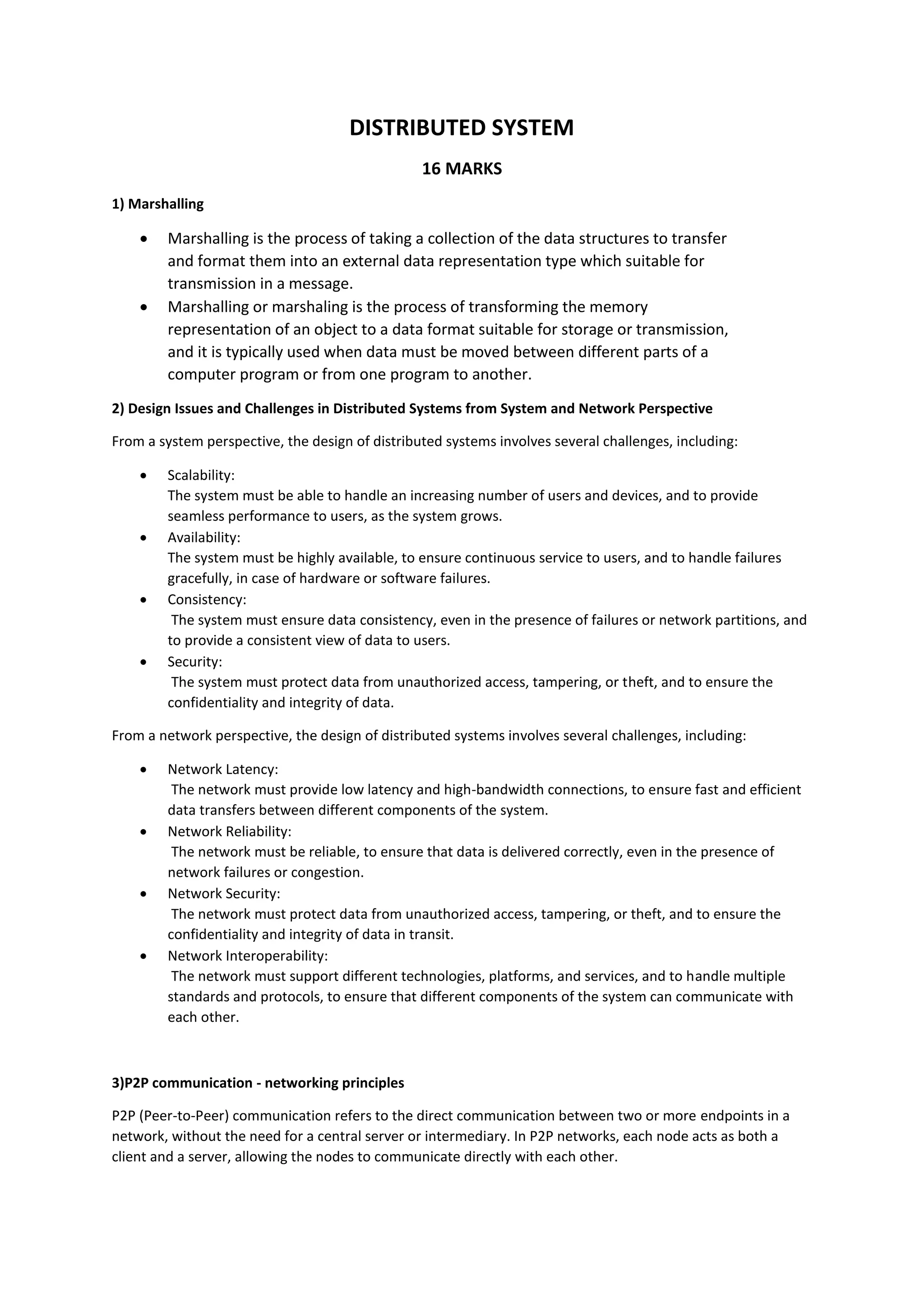 Marshalling is the process of formatting data structures for transmission between programs. Distributed systems face challenges related to scalability, availability, consistency, and security from both a system and network perspective. Peer-to-peer networks allow direct communication between nodes without a central server through decentralization, self-organization, scalability, and fault tolerance. Distributed systems improve efficiency by sharing hardware resources like processors and storage, as well as software resources like applications and services. Architectural models like client-server and functional models help define and design distributed systems. When designing client-server systems for telecommunications, considerations include network connectivity, scalability, security, resource management, data management, load balancing, quality of service, reliability, and interoper