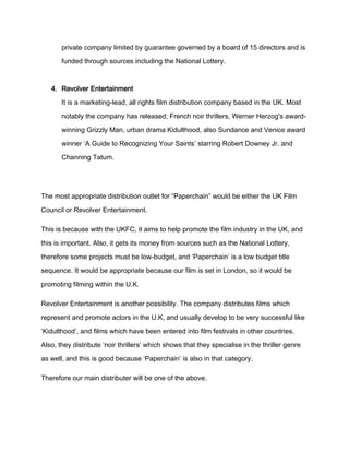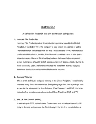 The document discusses several UK film distribution companies: - Hammer Film Productions, known for Gothic horror films from the 1950s-1970s with low budgets but lavish sets. - Dogwoof Pictures distributes documentaries and foreign films in the UK. - The UK Film Council was set up in 2000 to develop and promote the UK film industry using National Lottery funds. - Revolver Entertainment is a UK marketing and distribution company that has released films in various genres, including thrillers. The most appropriate distributors for the low-budget UK film "Paperchain" would be the UK Film Council, to promote the domestic film industry, or Revolver Entertainment given their experience with similar genres.